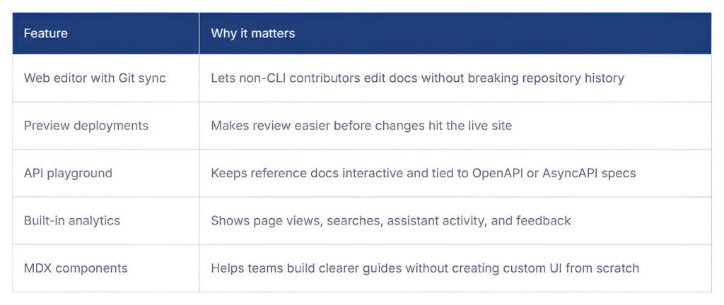 The most useful parts are those that reduce maintenance friction. Mintlify supports Git sync and MDX content, a web editor with visual editing and live preview, OpenAPI- and AsyncAPI-based API playgrounds, built-in analytics, a REST API, and a library of MDX components for code groups, steps, tabs, callouts, and API pages.
