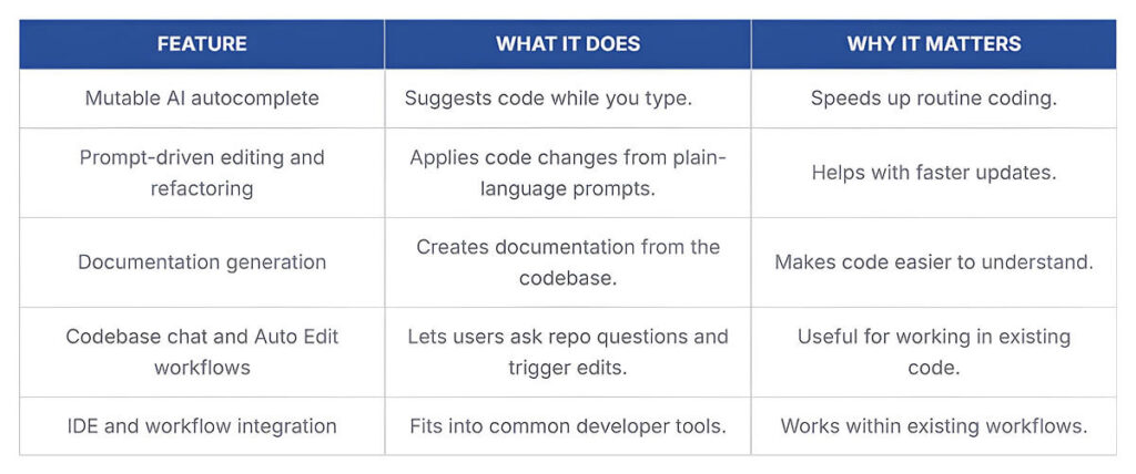 This section highlights the main mutable AI features that stand out from public information. Rather than focusing only on code completion, the platform appears designed to help developers work more effectively across the broader codebase.