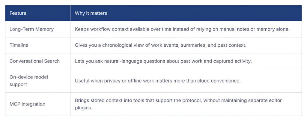 One practical detail is that Pieces is moving away from dedicated plugins toward MCP, which speaks volumes about how it approaches developer context management. That shift matters because the product now looks less like an editor add-on and more like a local context service that other tools can query.